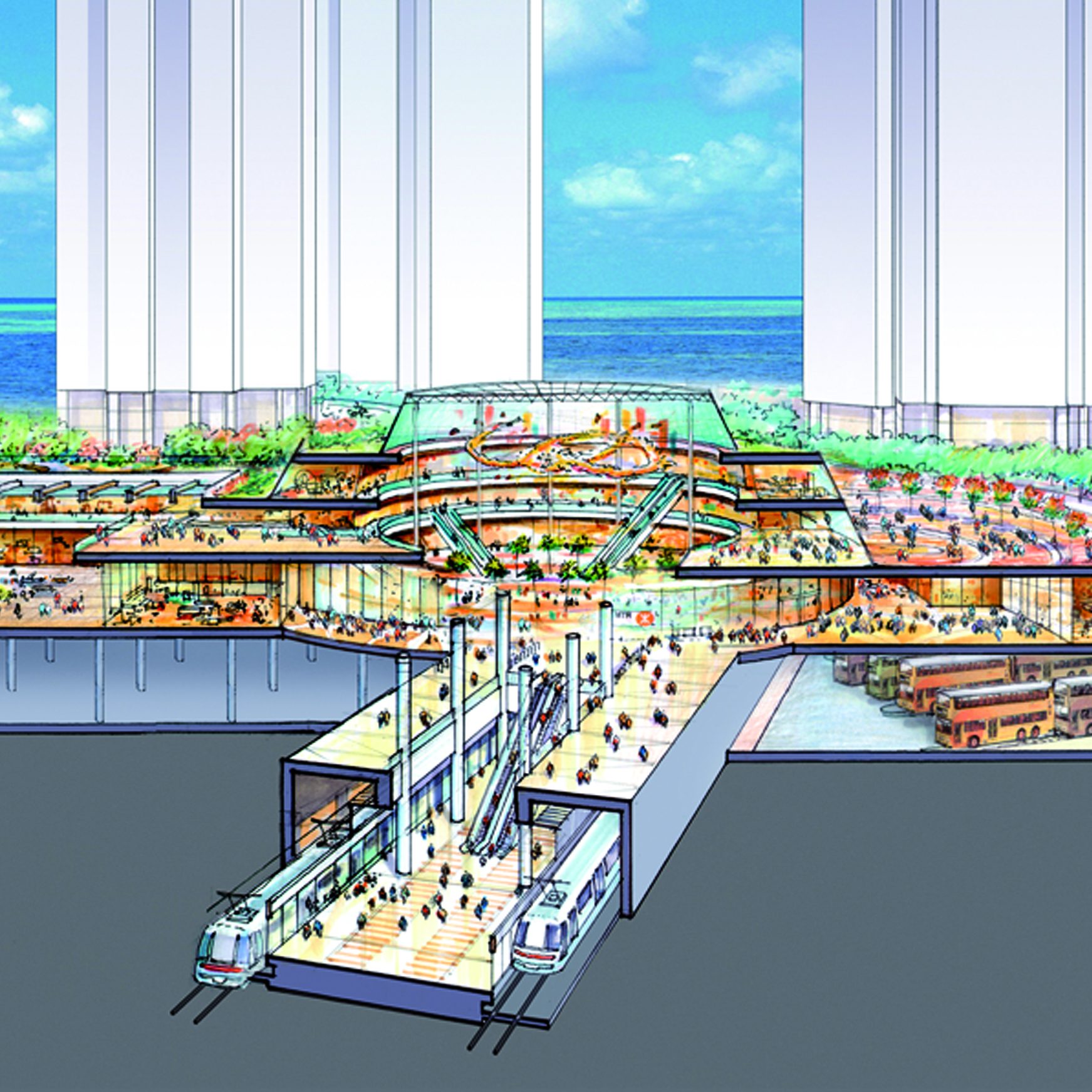 港鐵線及車站設於住宅區地下,與由填海而成的公園相連。整個規劃區設置大量綠化空間,行人路與行車道路完全分開。規劃區可容納超過54,000人。發展分期進行。各期以規劃區廣場、人行系統及綠化空間連繫。