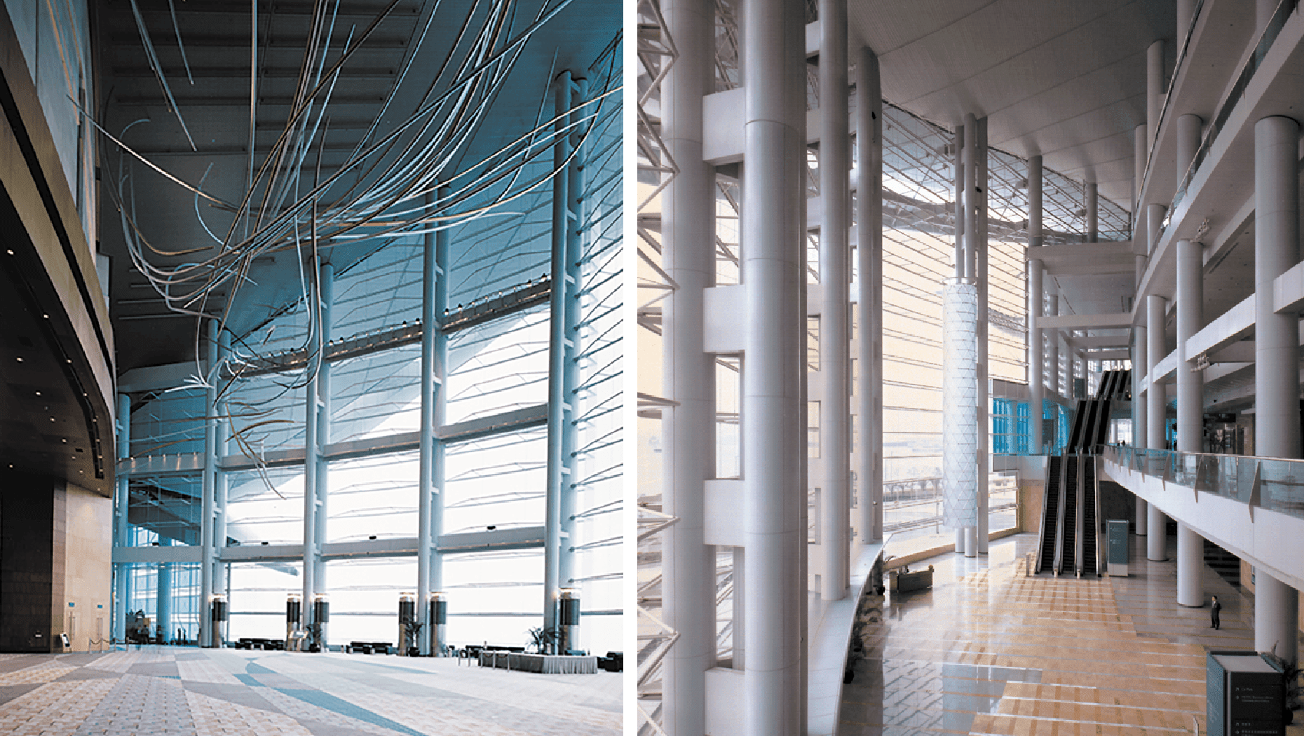 The original long-span Atrium was widened to achieve this. As the water channel under this part of the building is reserved for the future Central – Wanchai Bypass and the MTR Shatin-Central Line, there is no room to put down any foundations in the water channel. The expansion had to be constructed spanning the full 80 metres for every floor.