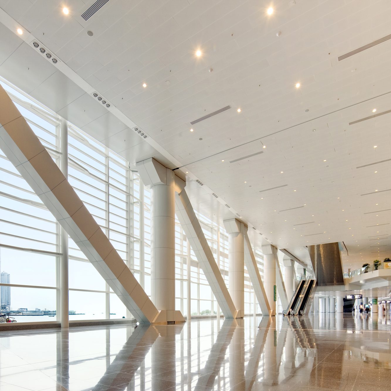 填海工地與相對的海岸線間預留有七十五米寬的水道,供將來興建公路幹線。會展中心原址與擴建部份由一個多層中庭連接,以貫徹會展中心的根本精神。